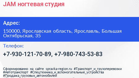 JAM, ногтевая студия по адресу 150000, Ярославская область, Ярославль, Большая Октябрьская, 35 в дальнейшем Организация, размещена в следующих категориях: