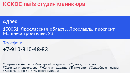 КОКОС nails, студия маникюра по адресу 150051, Ярославская область, Ярославль, проспект Машиностроителей, 23 в дальнейшем Организация, размещена в следующих категориях: