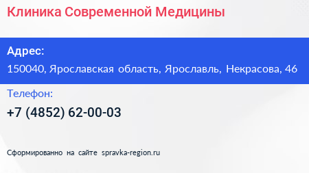 Клиника Современной Медицины по адресу 150040, Ярославская область, Ярославль, Некрасова, 46 в дальнейшем Организация, размещена в следующих категориях: