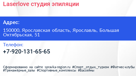 Laserlove, студия эпиляции по адресу 150000, Ярославская область, Ярославль, Большая Октябрьская, 51 в дальнейшем Организация, размещена в следующих категориях: