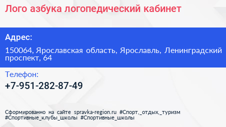 Лого-азбука, логопедический кабинет по адресу 150064, Ярославская область, Ярославль, Ленинградский проспект, 64 в дальнейшем Организация, размещена в следующих категориях: