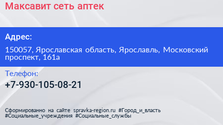 Максавит, сеть аптек по адресу 150057, Ярославская область, Ярославль, Московский проспект, 161а в дальнейшем Организация, размещена в следующих категориях: