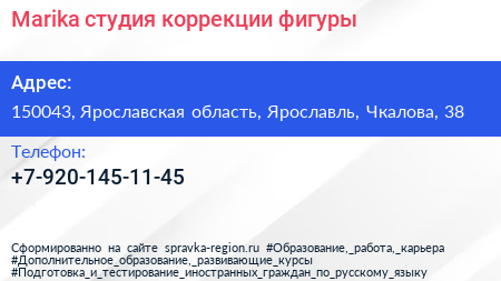 Marika, студия коррекции фигуры по адресу 150043, Ярославская область, Ярославль, Чкалова, 38 в дальнейшем Организация, размещена в следующих категориях: