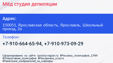 Мёд, студия депиляции по адресу 150051, Ярославская область, Ярославль, Школьный проезд, 2а в дальнейшем Организация, размещена в следующих категориях: