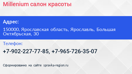 Millenium, салон красоты по адресу 150000, Ярославская область, Ярославль, Большая Октябрьская, 30 в дальнейшем Организация, размещена в следующих категориях: