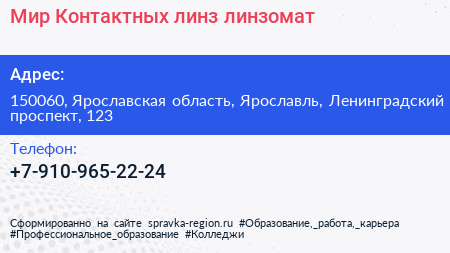 Мир Контактных линз, линзомат по адресу 150060, Ярославская область, Ярославль, Ленинградский проспект, 123 в дальнейшем Организация, размещена в следующих категориях: