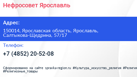 Нефросовет-Ярославль по адресу 150014, Ярославская область, Ярославль, Салтыкова-Щедрина, 57/17 в дальнейшем Организация, размещена в следующих категориях: