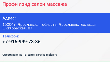 Профи лэнд, салон массажа по адресу 150049, Ярославская область, Ярославль, Большая Октябрьская, 87 в дальнейшем Организация, размещена в следующих категориях: