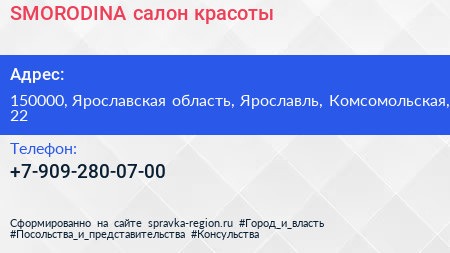 SMORODINA, салон красоты по адресу 150000, Ярославская область, Ярославль, Комсомольская, 22 в дальнейшем Организация, размещена в следующих категориях: