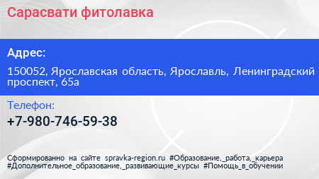 Сарасвати, фитолавка по адресу 150052, Ярославская область, Ярославль, Ленинградский проспект, 65а в дальнейшем Организация, размещена в следующих категориях: