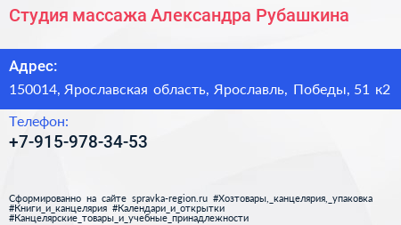 Студия массажа Александра Рубашкина по адресу 150014, Ярославская область, Ярославль, Победы, 51 к2 в дальнейшем Организация, размещена в следующих категориях: