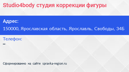 Studio4body, студия коррекции фигуры по адресу 150000, Ярославская область, Ярославль, Свободы, 34Б в дальнейшем Организация, размещена в следующих категориях: