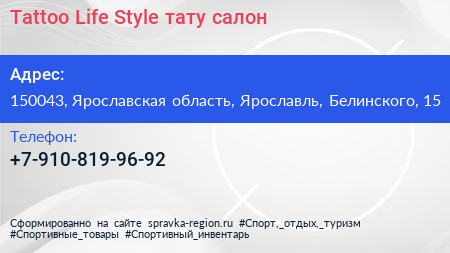 Tattoo Life Style, тату-салон по адресу 150043, Ярославская область, Ярославль, Белинского, 15 в дальнейшем Организация, размещена в следующих категориях: