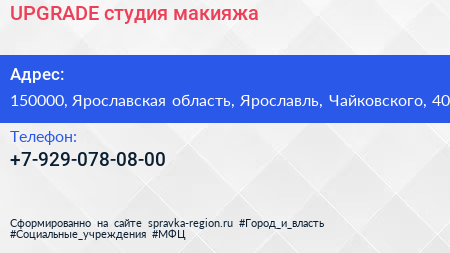 UPGRADE, студия макияжа по адресу 150000, Ярославская область, Ярославль, Чайковского, 40 в дальнейшем Организация, размещена в следующих категориях: