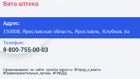 Вита, аптека по адресу 150008, Ярославская область, Ярославль, Клубная, 6а в дальнейшем Организация, размещена в следующих категориях: