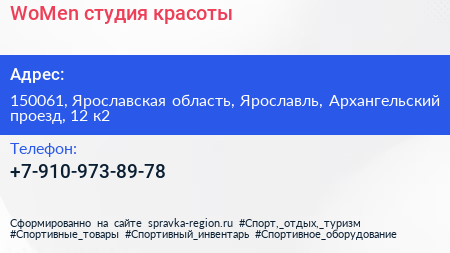 WoMen, студия красоты по адресу 150061, Ярославская область, Ярославль, Архангельский проезд, 12 к2 в дальнейшем Организация, размещена в следующих категориях: