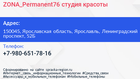 ZONA_Permanent76, студия красоты по адресу 150045, Ярославская область, Ярославль, Ленинградский проспект, 52Б в дальнейшем Организация, размещена в следующих категориях: