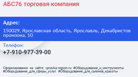 АБС76, торговая компания по адресу 150029, Ярославская область, Ярославль, Декабристов промзона, 10 в дальнейшем Организация, размещена в следующих категориях: