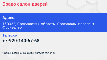 Браво, салон дверей по адресу 150022, Ярославская область, Ярославль, проспект Фрунзе, 30 в дальнейшем Организация, размещена в следующих категориях:
