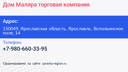 Дом Маляра, торговая компания по адресу 150049, Ярославская область, Ярославль, Вспольинское поле, 14 в дальнейшем Организация, размещена в следующих категориях: