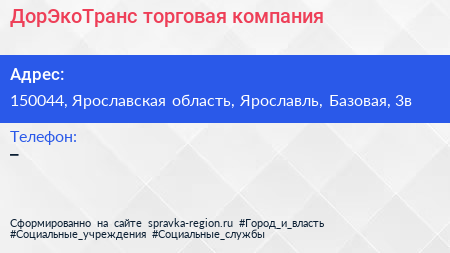 ДорЭкоТранс, торговая компания по адресу 150044, Ярославская область, Ярославль, Базовая, 3в в дальнейшем Организация, размещена в следующих категориях: