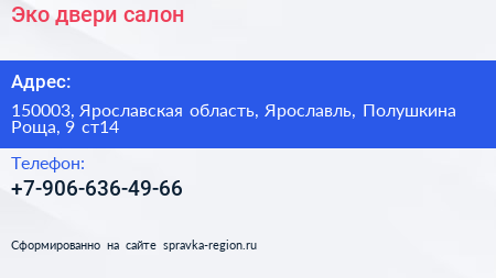 Эко двери, салон по адресу 150003, Ярославская область, Ярославль, Полушкина Роща, 9 ст14 в дальнейшем Организация, размещена в следующих категориях: