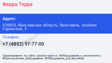 Ферра Терра по адресу 150052, Ярославская область, Ярославль, посёлок Суринское, 1 в дальнейшем Организация, размещена в следующих категориях: