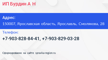 ИП Бурдин А.Н. по адресу 150007, Ярославская область, Ярославль, Смолякова, 28 в дальнейшем Организация, размещена в следующих категориях: