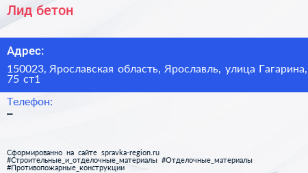 Лид бетон по адресу 150023, Ярославская область, Ярославль, улица Гагарина, 75 ст1 в дальнейшем Организация, размещена в следующих категориях: