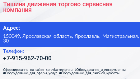 Тишина движения, торгово-сервисная компания по адресу 150049, Ярославская область, Ярославль, Магистральная, 30 в дальнейшем Организация, размещена в следующих категориях:
