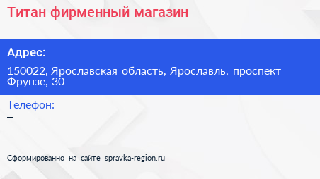 Титан, фирменный магазин по адресу 150022, Ярославская область, Ярославль, проспект Фрунзе, 30 в дальнейшем Организация, размещена в следующих категориях: