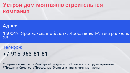 Устрой дом, монтажно-строительная компания по адресу 150049, Ярославская область, Ярославль, Магистральная, 38 в дальнейшем Организация, размещена в следующих категориях: