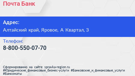 Почта Банк по адресу Алтайский край, Яровое, А Квартал, 3 в дальнейшем Организация, размещена в следующих категориях: