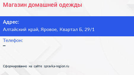 Магазин домашней одежды по адресу Алтайский край, Яровое, Квартал Б, 29/1 в дальнейшем Организация, размещена в следующих категориях: