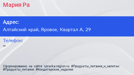 Мария-Ра по адресу Алтайский край, Яровое, Квартал А, 29 в дальнейшем Организация, размещена в следующих категориях: