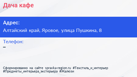 Дача, кафе по адресу Алтайский край, Яровое, улица Пушкина, 8 в дальнейшем Организация, размещена в следующих категориях:
