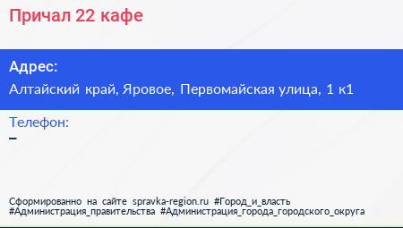 Причал 22, кафе по адресу Алтайский край, Яровое, Первомайская улица, 1 к1 в дальнейшем Организация, размещена в следующих категориях: