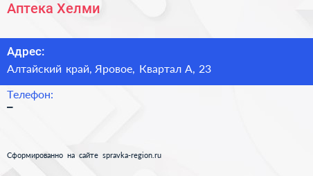 Аптека Хелми по адресу Алтайский край, Яровое, Квартал А, 23 в дальнейшем Организация, размещена в следующих категориях: