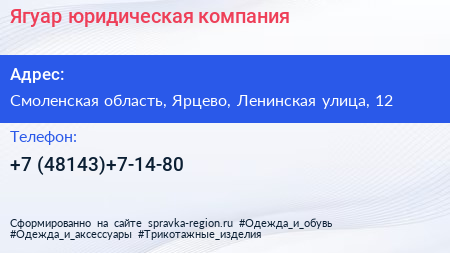 Ягуар, юридическая компания по адресу Смоленская область, Ярцево, Ленинская улица, 12 в дальнейшем Организация, размещена в следующих категориях: