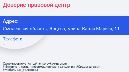 Доверие, правовой центр по адресу Смоленская область, Ярцево, улица Карла Маркса, 11 в дальнейшем Организация, размещена в следующих категориях: