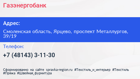 Газэнергобанк по адресу Смоленская область, Ярцево, проспект Металлургов, 39/19 в дальнейшем Организация, размещена в следующих категориях: