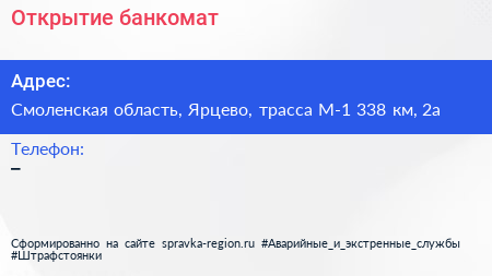 Открытие, банкомат по адресу Смоленская область, Ярцево, трасса М-1 338 км, 2а в дальнейшем Организация, размещена в следующих категориях: