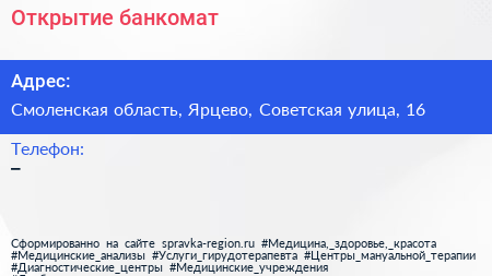 Открытие, банкомат по адресу Смоленская область, Ярцево, Советская улица, 16 в дальнейшем Организация, размещена в следующих категориях: