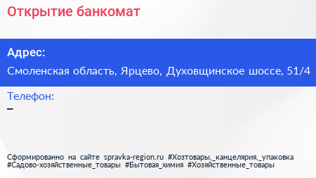 Открытие, банкомат по адресу Смоленская область, Ярцево, Духовщинское шоссе, 51/4 в дальнейшем Организация, размещена в следующих категориях: