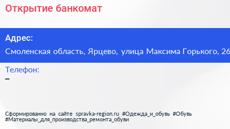 Открытие, банкомат по адресу Смоленская область, Ярцево, улица Максима Горького, 26 в дальнейшем Организация, размещена в следующих категориях: