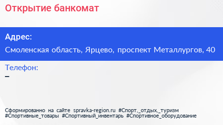 Открытие, банкомат по адресу Смоленская область, Ярцево, проспект Металлургов, 40 в дальнейшем Организация, размещена в следующих категориях: