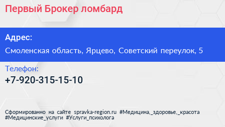 Первый Брокер, ломбард по адресу Смоленская область, Ярцево, Советский переулок, 5 в дальнейшем Организация, размещена в следующих категориях: