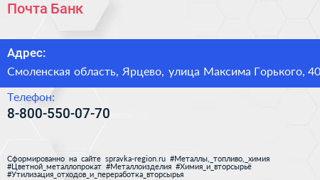 Почта Банк по адресу Смоленская область, Ярцево, улица Максима Горького, 40 в дальнейшем Организация, размещена в следующих категориях: