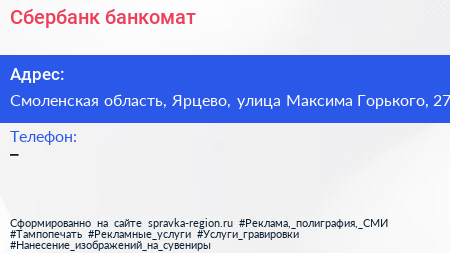 Сбербанк, банкомат по адресу Смоленская область, Ярцево, улица Максима Горького, 27 в дальнейшем Организация, размещена в следующих категориях: