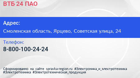 ВТБ 24, ПАО по адресу Смоленская область, Ярцево, Советская улица, 24 в дальнейшем Организация, размещена в следующих категориях: